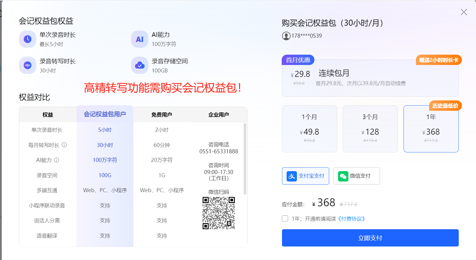 【注:高精转写功能需购买会记权益包才能使用】